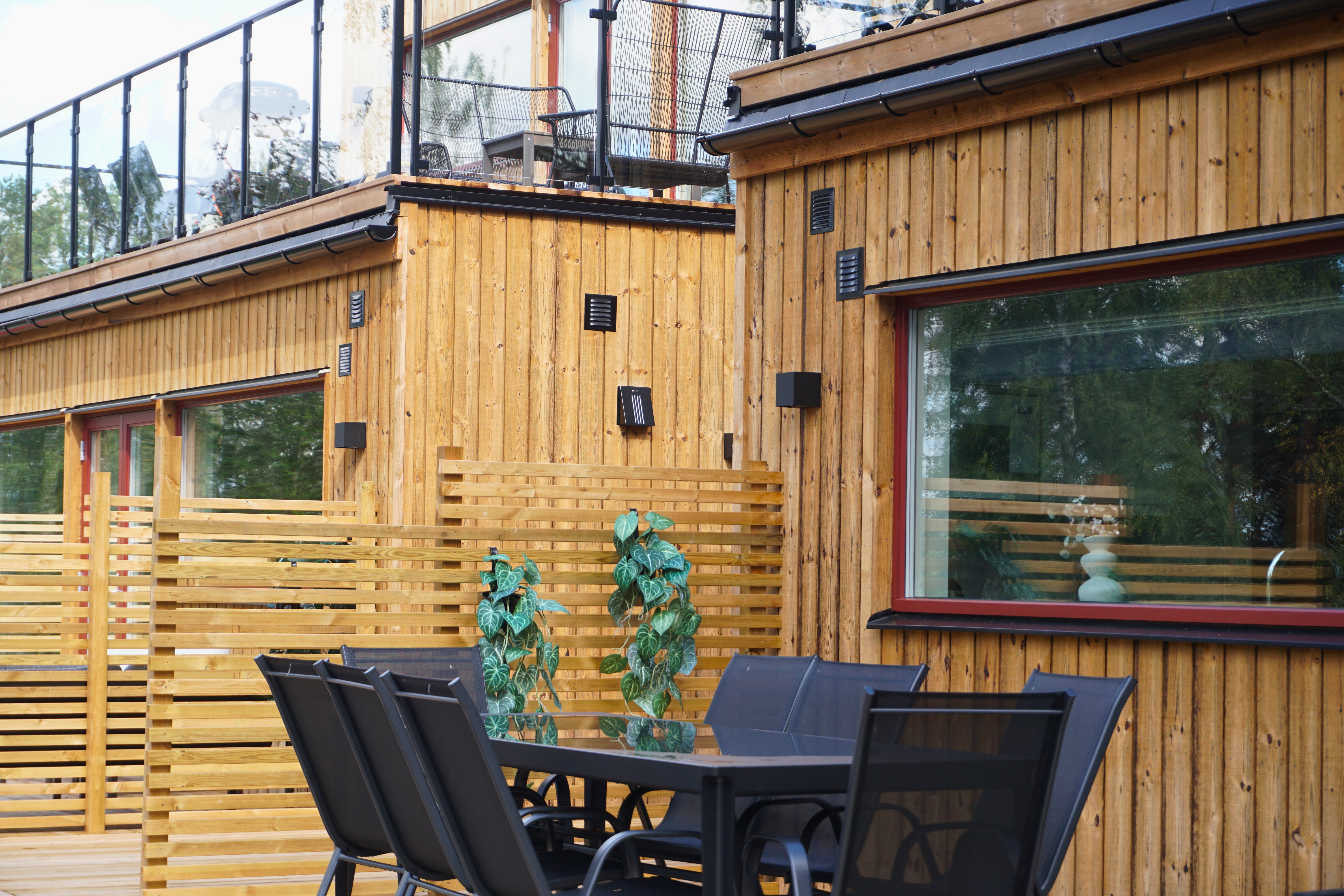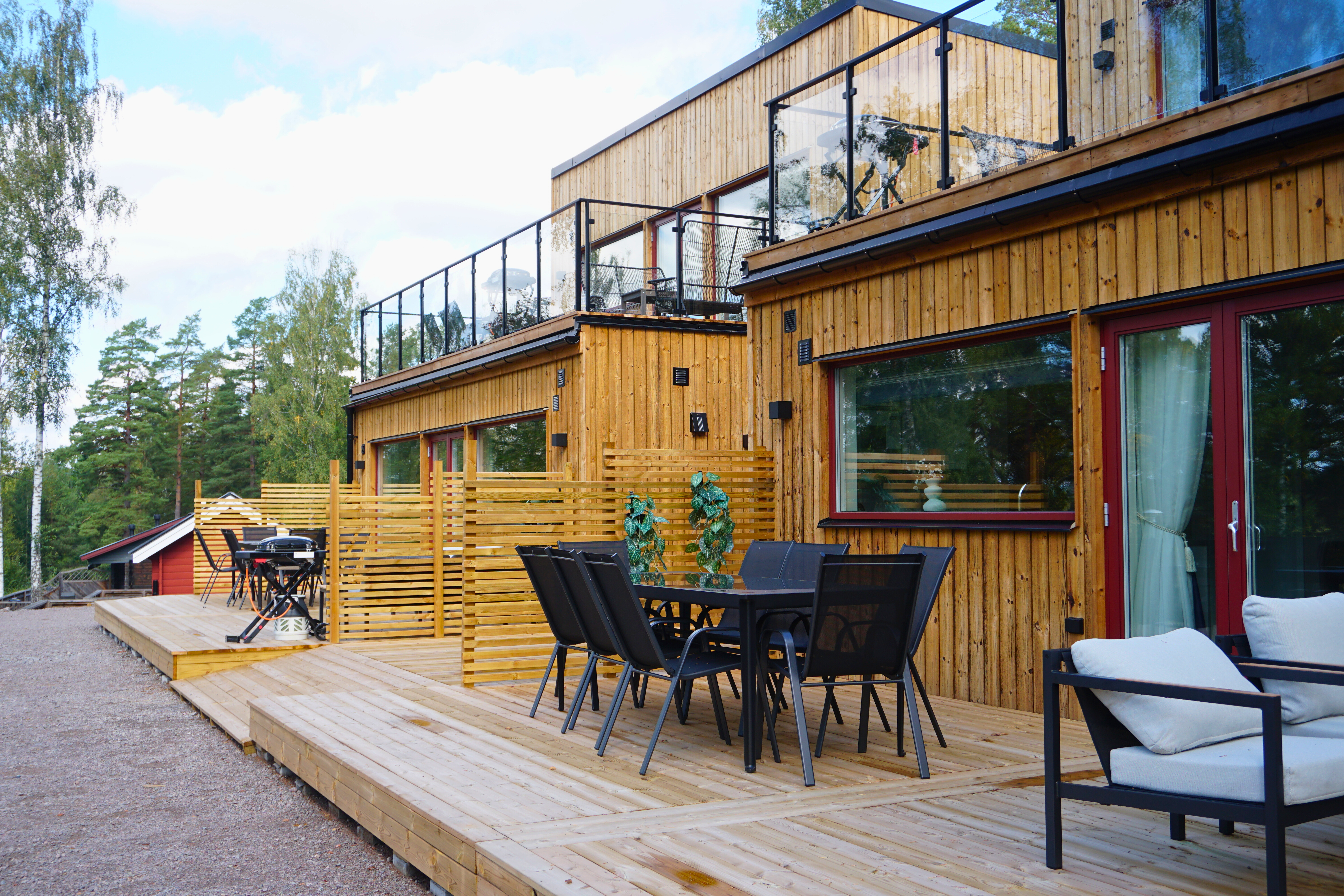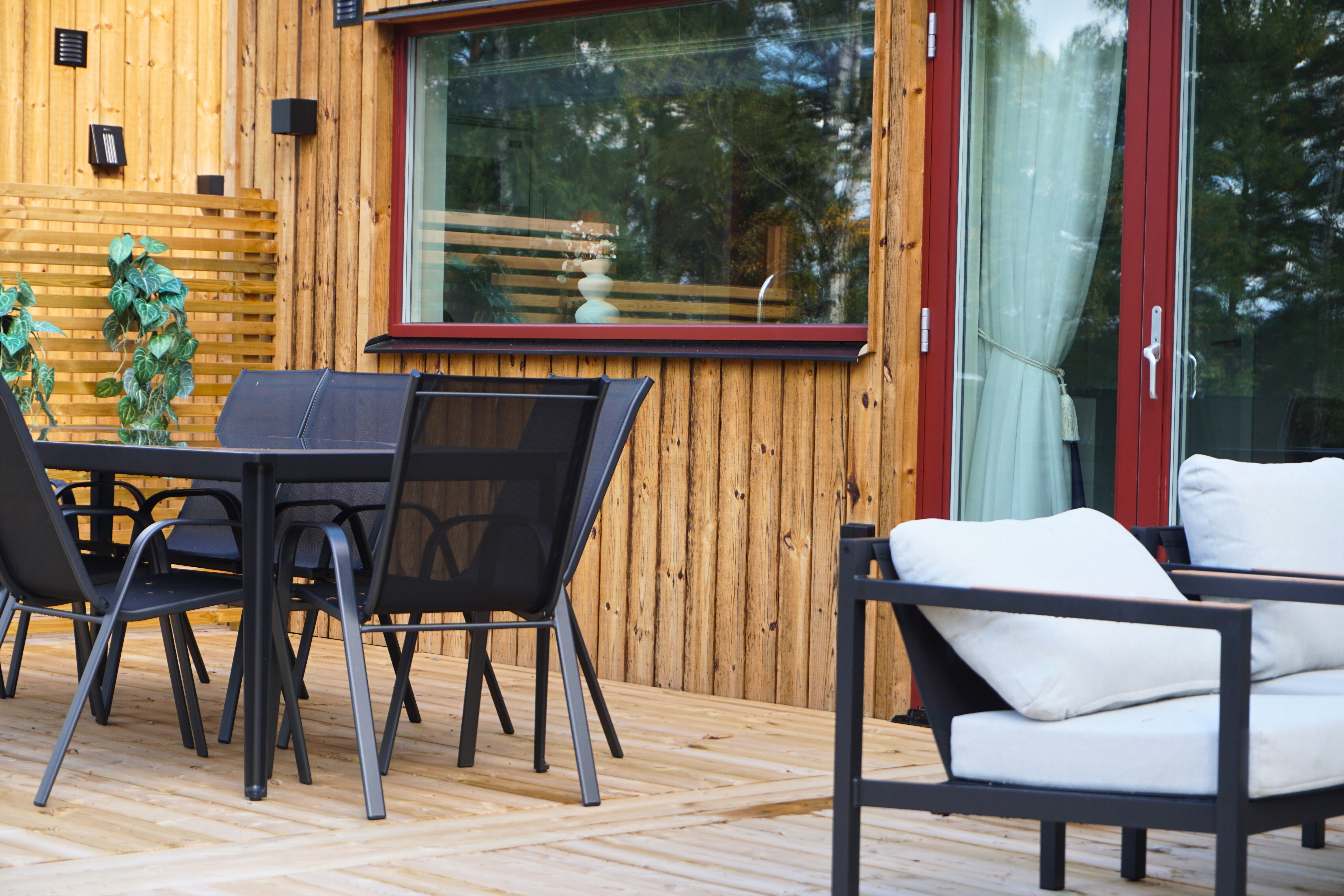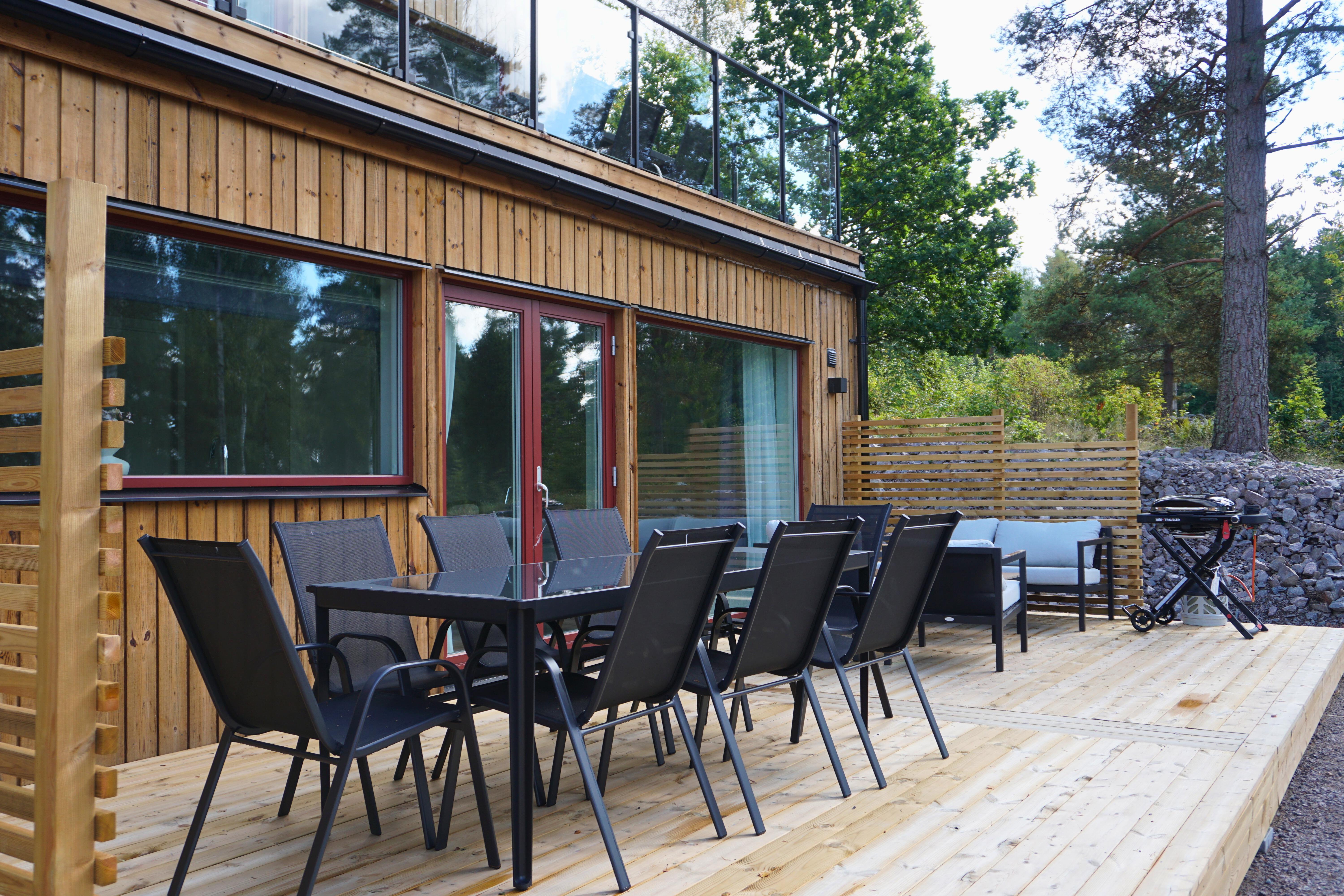 Utanför väntar en inbjudande uteplats med utsikt över den småländska skogen – och mellan träden glittrar sjön vackert i solljuset. Här kan du njuta av morgonkaffet i lugn och ro eller avrunda dagen med en grillkväll i naturens stillhet.